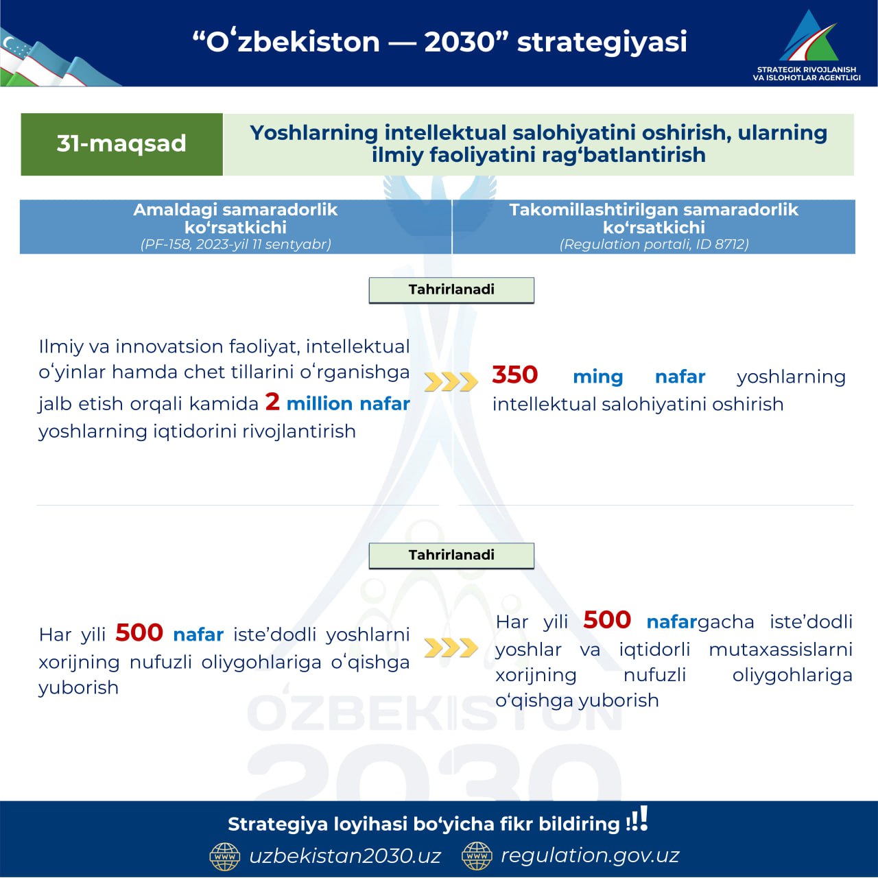 Takomillashtirilayotgan “O‘zbekiston – 2030” strategiyasi loyihasidagi asosiy o‘zgarishlar misollarda.